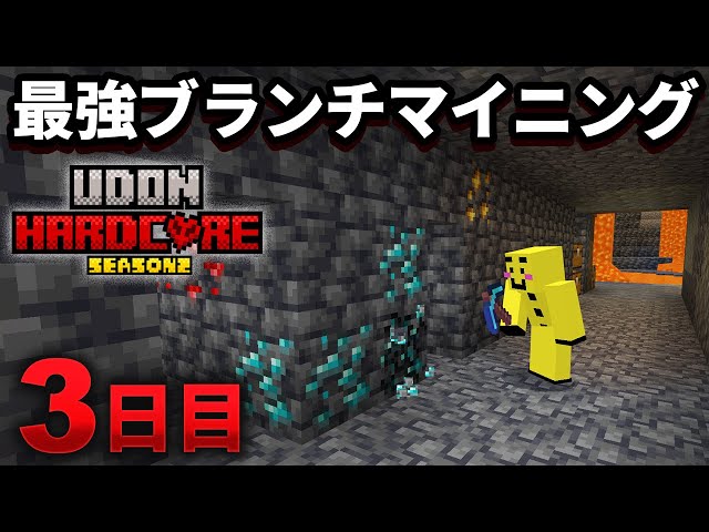 【マイクラ実況】最強のブランチマイニング法で速攻ダイヤ100個を手に入れてしまう【ウドンハードコア2】3日目